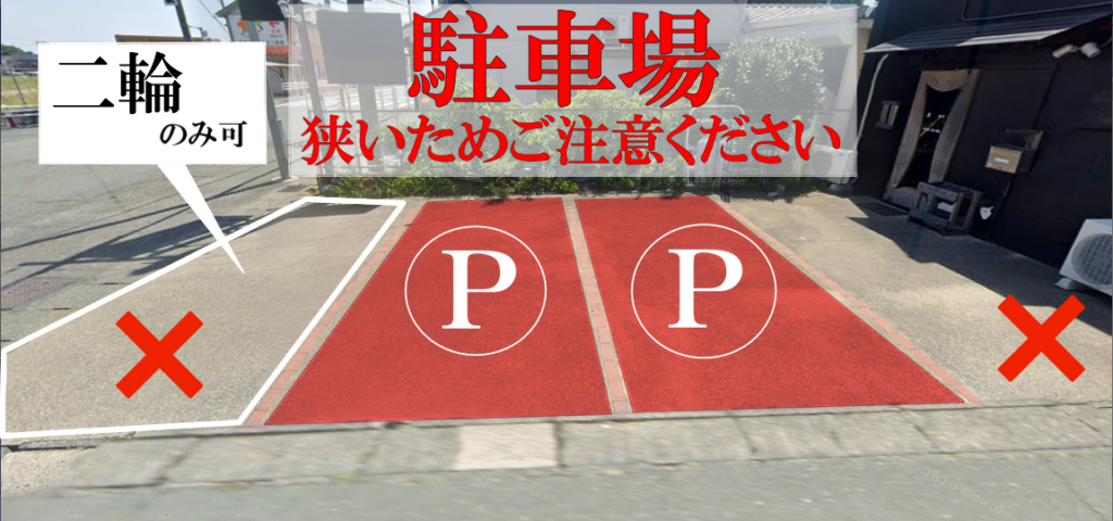 ・車でお越しの際、駐車場が狭いためご迷惑をおかけします。駐車が難しい場合はお手数ですが「豊鉄パーキング 高師駅」をご利用ください。